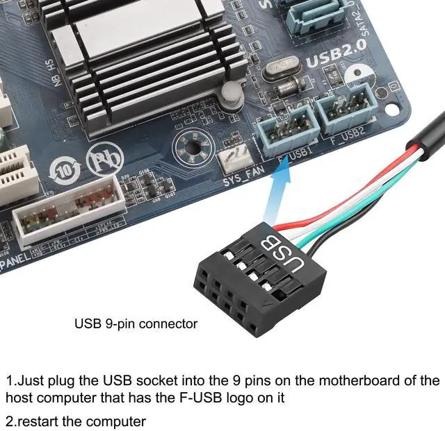 1: Just plug the USB socket into the 9-pin header with the F-USB logo on the motherboard of the host computer.