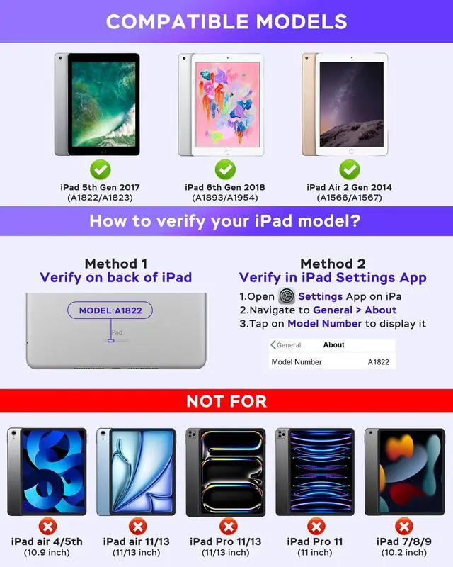 Compatibility: Keyboard case is compatible with iPad 9.7 inch 6th generation 2018 Released - A1893/A1954, iPad 9.7 inch 5th generation 2017 Released - A1822/A1823, iPad 9.7 inch Air 2nd Gen. 2014 Released - A1566/A1567. The case keyboard can be folded like a book and unfolded like a mini computer, easy to carry around, it's perfect for working, taking notes and typing in office, school or on travel ^^ Detachable