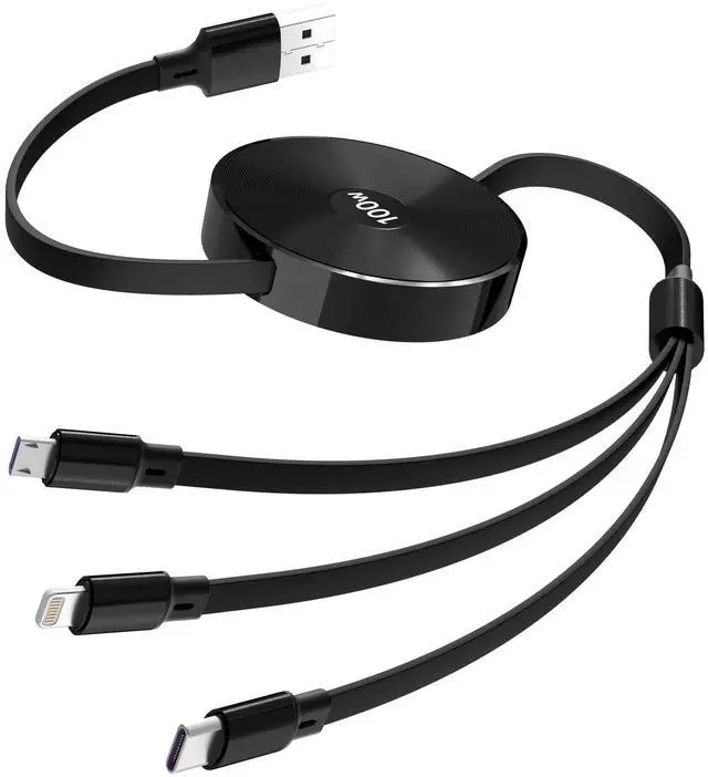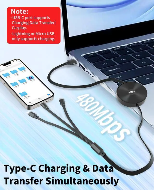 All Devices: This versatile retractable multi charging cable features three built-in connectors (USB-C, Lightning, Micro USB) in one sleek design, making it the ultimate multi charging cable solution. Perfect as a retractable car charger or travel companion, it supports A-C (100W), A-L (20W), and A-Micro USB (10W) configurations. The USB-C port alone enables charging, 480Mbps data transfer, and CarPlay. ^^ 100W Smart Fast Charging with