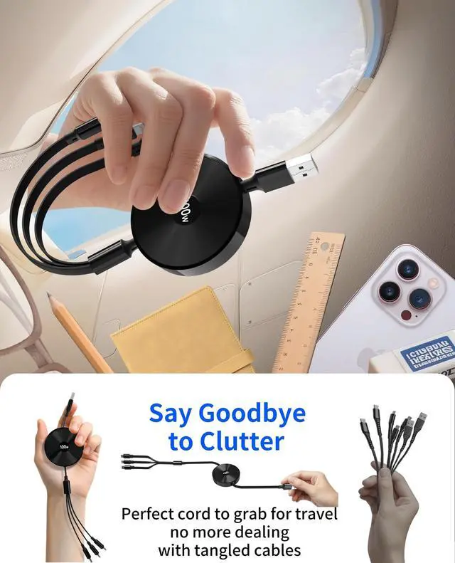 Safety Protection: Experience rapid charging with this retractable multi charger featuring E-Marker chip and pure copper wires delivering 100W power. Charges 16" MacBook Pro to 38% in 30 minutes, Galaxy to 80%, and iPhone 15 to 75%. Intelligent technology automatically switches to gentle trickle mode at 80% capacity, preventing overheating and overcharging for extended battery life. ^^