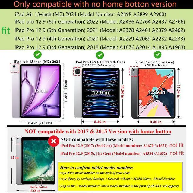 Compatible Models: for iPad Air 13 inch M3 2025 Release, (Model: A3268 A3269 A3271); for iPad Air 13 inch M2 2024 Release, (Model: A2898 A2899 A2900); for iPad Pro 12.9 inch 2022 Release, (6th