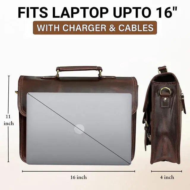 DescriptionIntroducing the epitome of sophistication and functionality: our Leather Messenger Bag for Men, a versatile companion crafted to elevate your daily endeavors. Step into the realm of timeless style and practicality with this meticulously designed leather briefcase for men. Handmade from real rugged buffalo leather, this leather laptop bag for men exudes an aura of authenticity and durability. With dimensions measuring 16 x 11 x 4 inches, it effortlessly accommodates your favorite Macbooks, Chromebooks, and laptops up to 15 inches in size, ensuring your essentials are always within reach. Whether you're navigating the boardroom or strolling through the city streets, this leather satchel for men effortlessly transitions between business and casual settings. Its urban and hip design, accentuated by brass buckles and fittings, seamlessly blends with any attire, making it the perfect leather bag for the modern gentleman. Experience unparalleled comfort during long journeys with its fully adjustable and removable shoulder strap, while the security strap provides peace of mind on the go. Quick access to your belongings is guaranteed with multiple compartments, including inner and external zipped pockets, ensuring efficient organization for your laptops, iPad, and tablets.