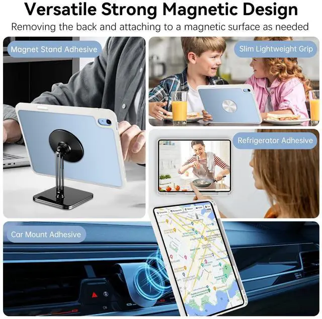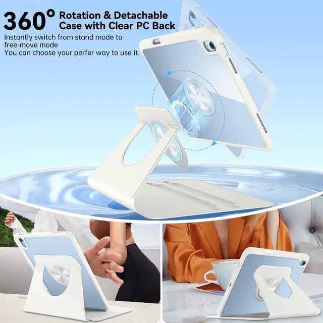 Compatible iPad ModelDesigned exclusively for iPad 11th Gen 11-inch (2025, Model: A3354/A3355/A3356) and iPad 10th Gen 10.9 -inch (2022, Model: A2696/A2575/A2777). Please confirm your iPad model before purchasing. 360 Rotating & Detachable DesignFeatures a 360 rotating stand for stable portrait or landscape viewing at multiple angles. Comes with a detachable PU leather back shelluse it or remove it as needed for flexible convenience. Super Strong Magnetic AttachmentEquipped with N52 magnet arrays for a secure grip on all metal surfacestripods, stands, refrigerators, and more. Ideal for hands-free viewing, cooking, exercising, or FaceTime. Built-in Apple Pencil HolderIntegrated slot securely holds your Apple Pencil while on the go. Easy to insert and removenever lose your stylus again. Full Protection & Precise CutoutsCombines a durable PU leather exterior with a soft microfiber interior to prevent scratches. Hard PC back and flexible TPU frame guard against drops and impacts. Precise cutouts allow full access to ports, buttons, and support for Apple Pencil charging (adapter required) and Touch ID. Auto Wake & Sleep FunctionBuilt-in magnets automatically wake or sleep your iPad when the cover is opened or closed. Helps preserve battery life and enhances everyday convenience. Package Includes1 Magnetic Rotating Case for iPad (Apple Pencil and adapter not included)