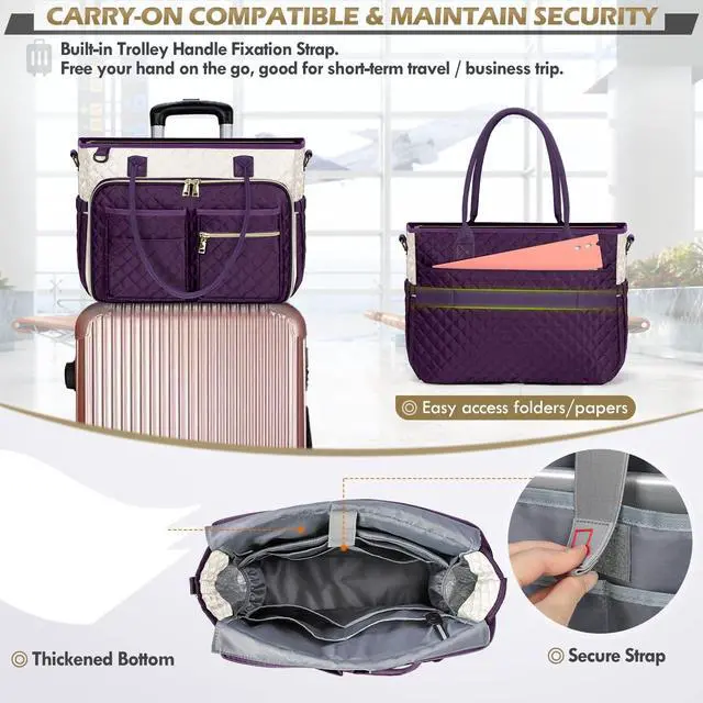 W x 12.6"H; weight: 2.2 lbs. Double layers of the front organized compartment aim to store scattered items. The front zip compartment features 4 elastic loops, one open pocket, and one mesh pocket, it's easy to stay organized with all of the different pockets. The 3 open pockets and a zip pocket in front offer easy access for items on hand. It also features a paper pocket in the back ^^ LONG LASTING MATERIALS- Made of durable water & scratch resistant polyester fabric, with smooth golden zippers, sturdy handle, and adjustable padded shoulder straps, nurse work bag prefect combination of stylish and functional. Reinforced stitching at each stress point ensures the laptop briefcase durability for long-term performance. High quality quilted teacher laptop tote bag aims to provide a sturdy and reliant user experience ^^ CONVENIENCE DESIGN FOR TRAVELERS- The luggage strap in the back allows this women tote bag to slide over the luggage tube, to free your hand on the go. The standard size of this women laptop bag makes this a good airplane travel bag, it is able to fit in the overhead bin and under seat space.