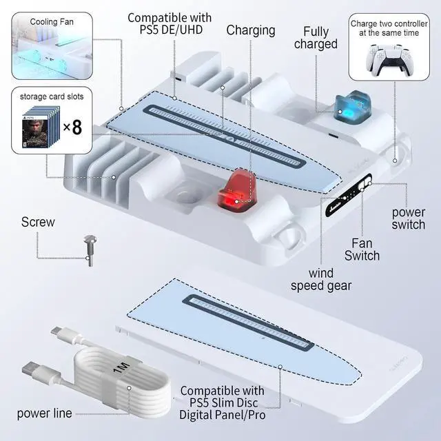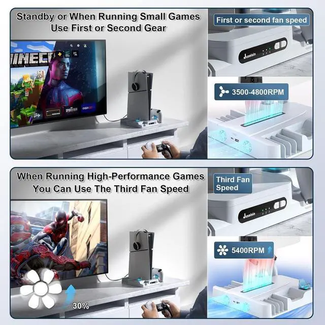 Performance Cooling Fan: Banish overheating and performance throttling from your gaming sessions with a whisper-quiet 3-speed cooling fan This high-efficiency PS5 cooler actively pulls hot air away from your console ensuring it stays cool and runs flawlessly during the most demanding gameplay ^^ Always Ready Dual