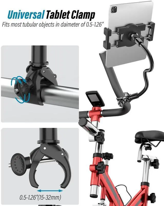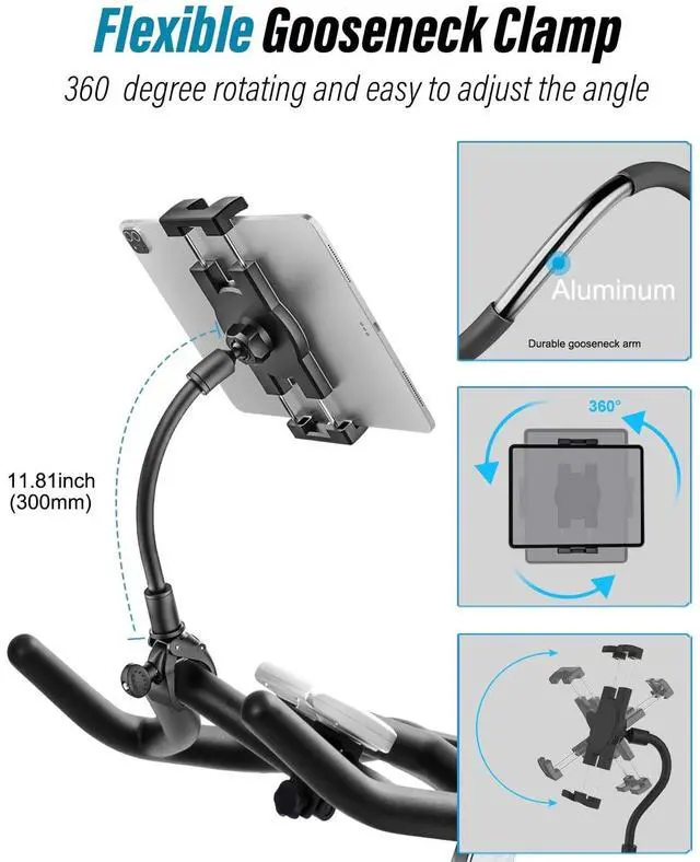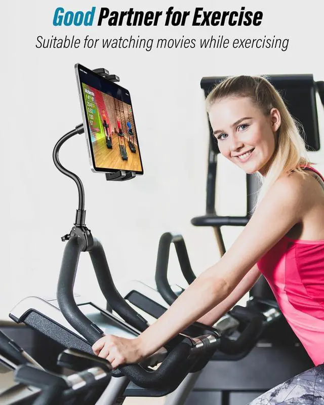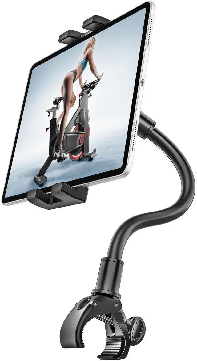 ^^ Goodfitness BuddyThis treadmill tablet holder keeps the tablet at the right distance from your eyes. Adjustable design gives you the best angle to watch a fitness instructional video or TV show, freeing your hands and relieving neck fatigue, ideal for watching sports channels from your tablet while working out on treadmills, gym aerobic training equipment (with handles) and ellipticals. ^^ Universal 2 IN 1 Broad CompatibilityThis indoor cycling tablet mount fit for all 4.7" -13" inch screen smartphones and tablets, such as new 2024 iPad Pro 13-in. / 12.9 / 11/ 10.5 / 9.7, iPad Air 6/ 5/ 4, iPad Mini 6/ 5, iPad 10th Generation; Galaxy Tab S, Galaxy Tab A; Fire HD; Surface Pro, Surface Go; Nexus Tablets; Android Tablet PC series; iPhone 16 Pro Max, 15, 14, 13, 12, 11, Xs; Galaxy Z Fold 6/ 5/ 4/ 3/ 2, Galaxy S24 / S23; e-Readers etc more tablets and smartphones with or without a case or sleeve.