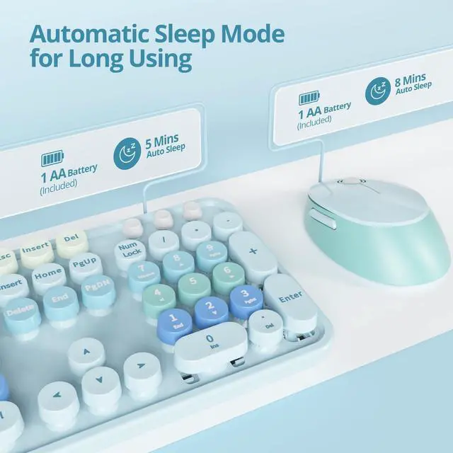 Mouse Combo: Our ergonomic keyboard and mouse combo comes with built-in power-saving modes, automatically entering sleep mode after 5 minutes of keyboard inactivity and 8 minutes of mouse inactivity. Simply tap any key to awaken them from sleep mode, ensuring energy efficiency without sacrificing performance.