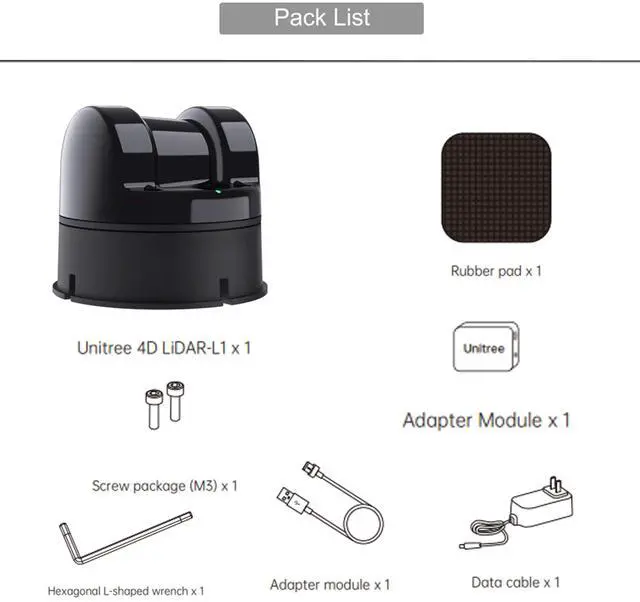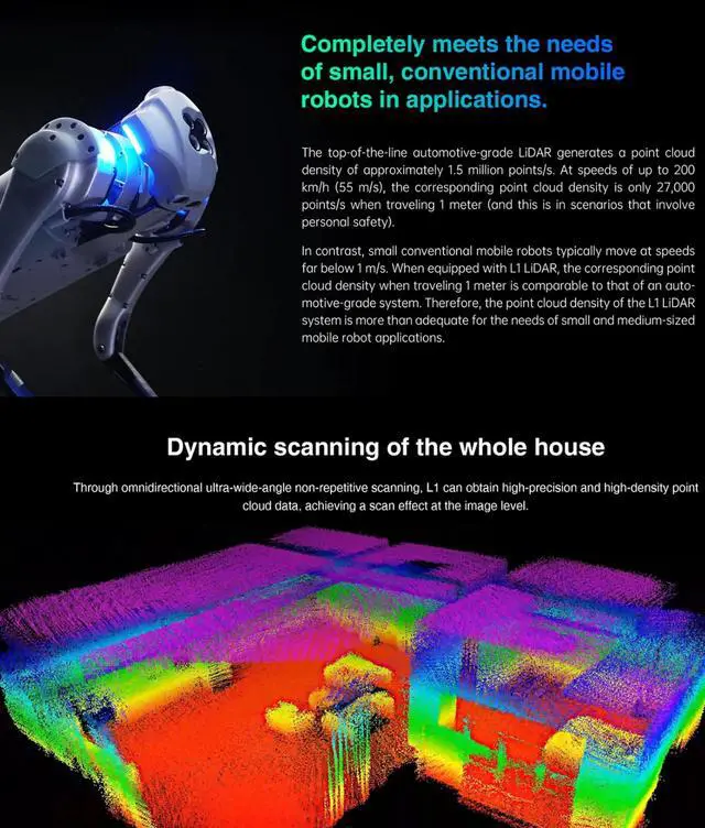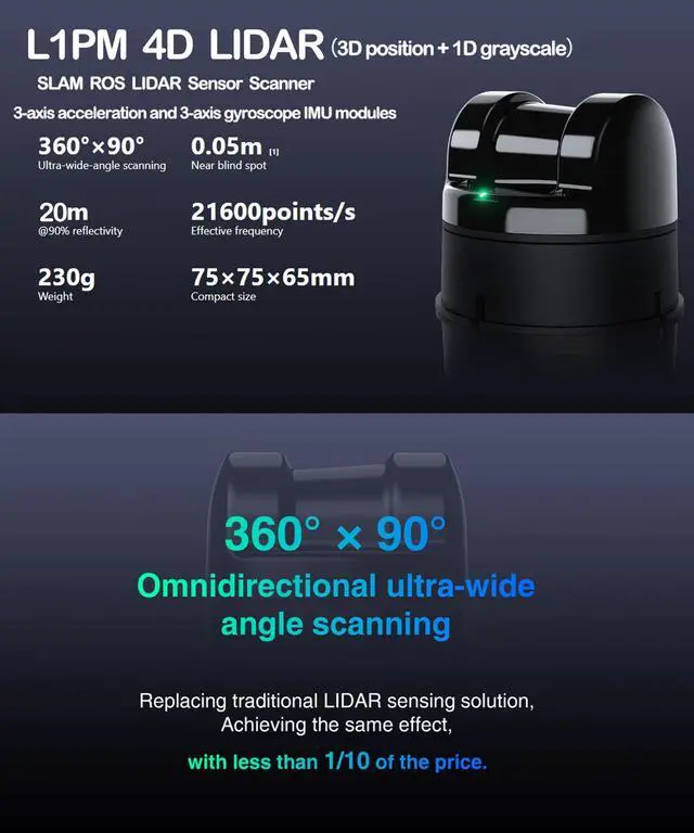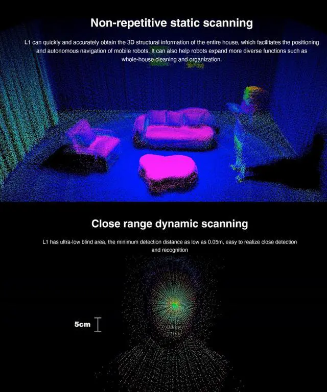It can realize three-dimensional space detection with a hemispherical field of view, and its application range can be expanded to More commercial scenarios. ^^ [High-speed Ranging Sampling] 4D-LiDAR L1 is a 4D lidar (3D position + 1D grayscale), which can be widely used in robots, smart cities, smart toys, logistics and other fields, supporting mapping, positioning, identification, avoidance Implementation of functions such as obstacle, environment scanning, and 3D reconstruction. ^^ [Whole House Dynamic Scanning] L1 4D lidar can quickly and accurately obtain the three-dimensional structural informati[Ultra-low Blind Zone] L1 3D lidar has an ultra-low blind zone and a minimum detection distance of 0.05 m, making it easy to achieve close range detection and recognition.