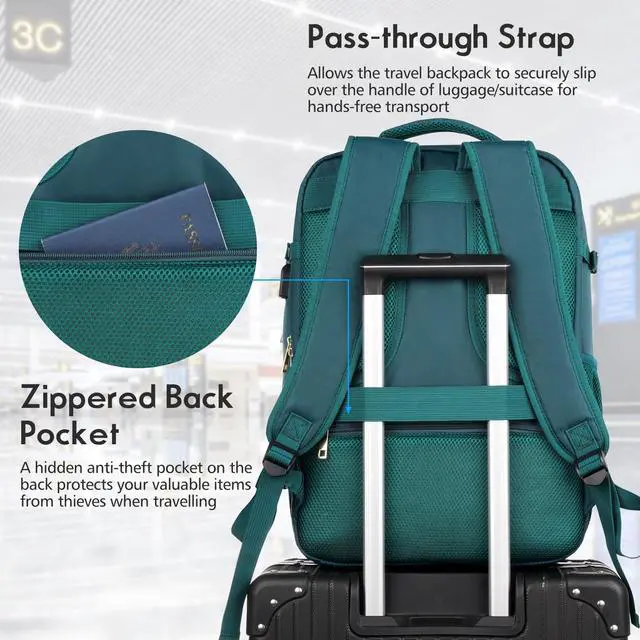 Pocket&Luggage Strap: USB interface with built-in cable design, great convenience for charging your electronic devices via connecting your own power bank. Comfortable breathable back design gives you maximum back support; A luggage strap allows the travel backpack to securely slip over the handle of any rolling luggage for hands-free transport, easier carrying. A hidden anti theft pocket on the back protect your valuable items from thieves.