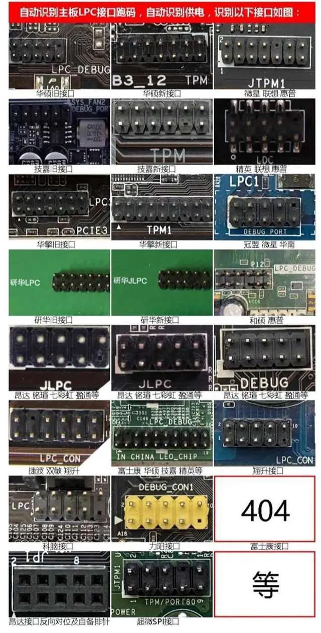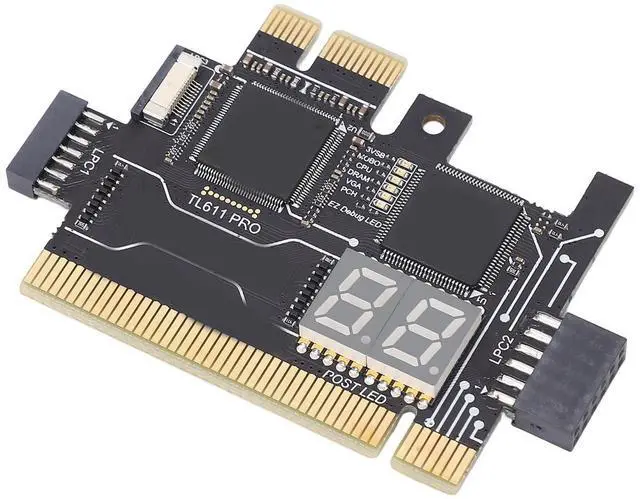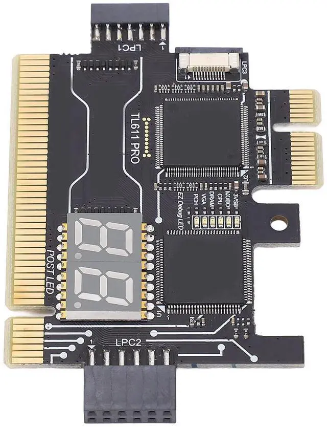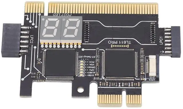 Settings: 01, LPC1 Shared high speed channel = Connect mainboard 2.0 pin bar and Notebook for MINI PCIE. 02, PCI High speed channel = Support for all PC slots. 03, LPC2 shared high speed channel = Connect motherboard 2.54 large row of pins and ultra micro SPI. 04, PCIEX1 High speed channel = Can test for Gigabyte without PCI motherboard. 05, LPC3 shared high speed channel = Connect the laptop for MINI PCIE, for A DEBUG conversion card, for DEBUG CON, for EC DEBUG. 06, 3VSB power indicator to check whether the power supply is normal. 07, MOBO mainboard indicator, check whether the mainboard is normal. 08, CPU indicator, check whether the CPU module is normal. 09, DRAM memory indicator, check whether the memory module is normal. 10, VGA graphics card indicator, check whether the graphics card module is normal. 11, PCH Southbridge indicator, check whether the Southbridge module is normal. 12, Tie a golden cord or take a key chain. 13, DP decimal point, CLK display.