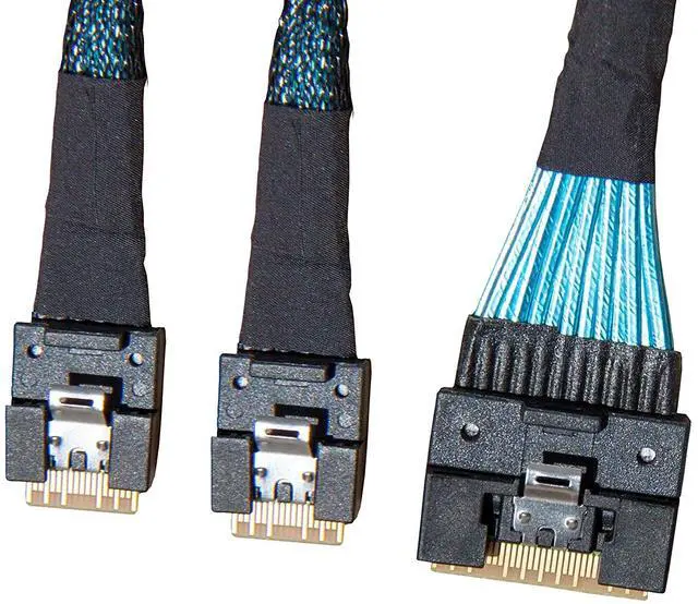 SlimSAS x8 74pin (SFF-8654) to two SlimSAS x4 38pin (SFF-8654) Y-Cables ^^ SFF-9402 Reference Multi-Protocol Internal Cables for SAS and/or PCIe For SAS-4 (SFF-8654)/ Other Protocol (SFF-8654) x8 Connections only ^^ SlimSAS x8 74pin (SFF-8654) Plug to two SlimSAS x4 38pin (SFF-8654) Plug