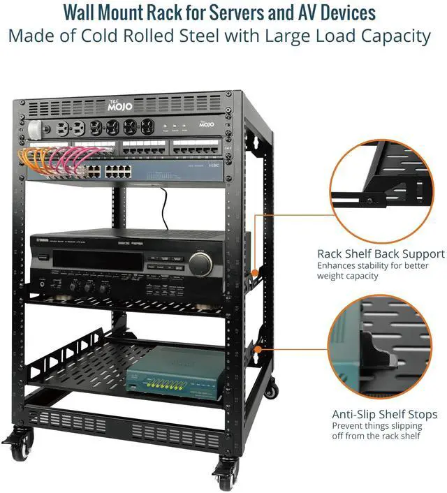 Powerful load-bearing Constructed from durable Cold Rolled Steel, Rack Shelf Back Support enhances stability, wall-mounted capacity of 130lbs, the ground-mounted up to 260lbs ^^ Considerate DesignsOpen-frame layout, including a top panel adding space, Anti-Slip Shelf Stops fixing devices and compatible racks for stack and expansion to meet requirements of home server rack ^^ Complete AccessoriesA 16U open frame server rack, two ventilated shelves, four shelf stops, four velcro straps and a set of equipment mounting screws ^^ Versatile ApplicationIdeal for space-efficient multi-device setups in warehouses, retail, classrooms, offices and more; Excellent choices as AV Rack/IT Rack ^^ Effortless Setup Network Rack includes hardware, a comprehensive manual, mounting hole drilling template and an online assembly video to simplify setup