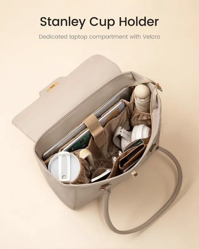 Wide-Opening FlapFeaturing a practical wide-open flap and a sturdy rotating turn-lock closure, this tote bag for women offers easy access to your essentials like phones, lipstick, files, sunglasses ^^ Soft PU LeatherDesigned with pebble soft faux leather, this unstructured laptop tote blends exceptional comfort with a chic look, making this a great work bag or everyday tote ^^ 15.6 Inch Laptop CompartmentThis laptop bag has 1 padded 15.6" laptop compartment, 1 iPad tablet pouch, 2 pen slots, 2 slip pockets, 2 side pockets, 1 inner and 1 rear zipper pocket for your items ^^ Comfy HandlesLong, reinforced top handles make this large tote bag for women effortless to carry by hand or comfortably over your shouldereven with heavy loads ^^ Stanley Large Bottle Inner PocketThe interior pocket can keep a 40oz Stanley water bottle or tumbler upright and easy to grab, which is a must-have for busy teachers, travelers, and commuters ^^ Timeless & Versatile ColorsThis laptop tote bag for women comes in a variety of classic, stylish colors, making it an ideal complement for both professional and casual outfits ^^ Perfect Christmas GiftThis tote bag is ideal as an everyday tote, work purse, or women's briefcase, making it a thoughtful gift for teachers, nurses, businesswomen, and moms.
