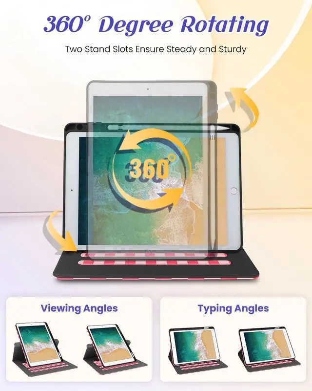 • 360 Rotating Stand: This for iPad case 5th generation/for iPad Air 1st generation case/for iPad Pro 9.7 inch case with an functional rotating stand design, supporting your devices to switch between landscape and portrait orientations. While 2 anti-slip strip design allow for multiple horizontal stand angles for comfortable viewing or typing