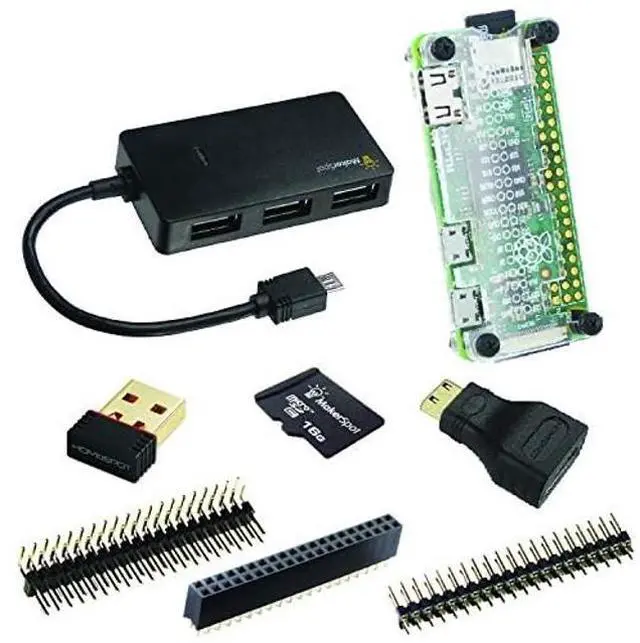 This pack includes: <1> WiFi Dongle Connect your Pi Zero to the WiFi network! This WiFi dongle features one of the most common WiFi chipsets Realtek RTL8188 in the Pi community. Plug and play for Raspberian and many other Pi OSes. <2> USB OTG HUBThe 4-port USB OTG hub extends the micro USB OTG port on the Pi Zero and allows you to plug in more USB devices such as keyboard, mouse, and WiFi dongle. <3> 32GB MicroSD Card32GB MicroSD memory card optimized for 4K/4KQD32 chunks read/write. Preloaded with the latest version of NOOBS installer. <4> Mini HDMI to HDMI AdapterConvert the Mini HDMI port on the Pi Zero to a standard size HDMI jack. Support 1080p video and audio output. 3x20 Pin Header Set <5> 0.1" 2x20-Pin Male Header (1pack) <6> 0.1" 2x20-pin Female Header (1pack) <7> 0.1" 2x20-pin Strip Right-Angle Male Header (1pack) All are gold-plated and ROHS qualified. <8> Pi Zero ProtectorProtect your Pi Zero against physical damage with this simple-yet-effective acrylic casing with screws. Imprinted with GPIO pins (on top piece) guides you the correct connection.