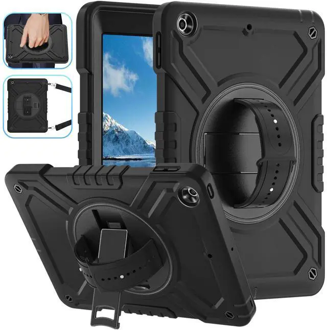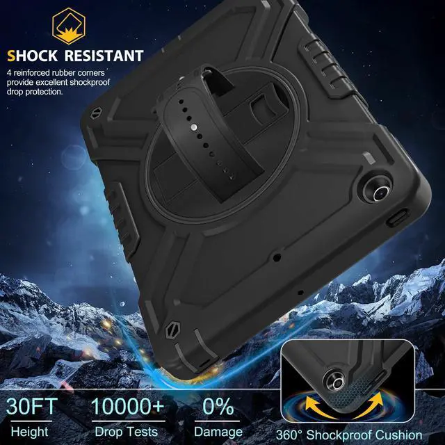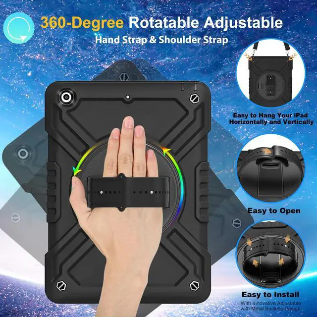 360 Degree Rotating & Multi-Angle Kickstand The iPad 5th/6th Generation case for kids features a built-in 360-degree swivel foldable sturdy kickstand. It supports multiple viewing angles, both vertical and horizontal, making it ideal for watching videos, typing, attending conferences, and drawing, all while keeping your hands-free. This sturdy kickstand can be easily folded when not in use ^^ Adjustable Hand Strap & Detachable Shoulder StrapThe adjustable silicone hand strap provides a comfortable and secure grip, making it a must-have feature when showcasing your iPad to others. The detachable shoulder strap offers added security when carrying your iPad during traveling, hiking, or other outdoor activities.