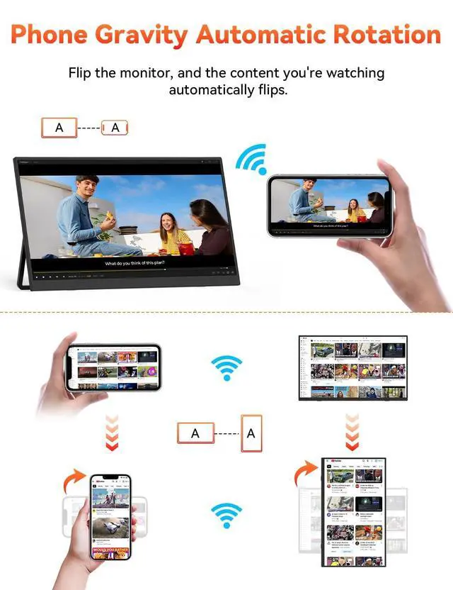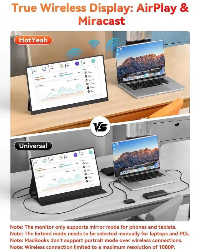 True Wireless, Instant Screen SharingSay goodbye to messy cables! This wireless portable monitor supports AirPlay & Miracast, allowing instant screen mirroring or extension with one tap. Perfect as a portable monitor for laptop, iPhone, iPad, Android, MacBook, and Windows devices. Ideal for remote work, travel, or presentations.
