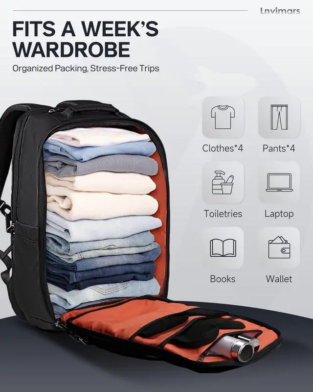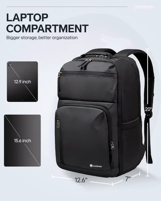 Durable Material &SolidThe Lnvimars backpack for travel measures 20''* 12.6 ''*7''inches. This travel backpack for men and women helps you pass through security check quickly, compliant with airline carry-on requirements. Laptop backpack made of high-quality polyester fiber material, Heavy duty large notebook backpacks suitable for cities. ^^ Large Capacity & Multiple Pockets The Lnvimars travel backpack designed with multi functional pocket for travel necessities. It has main pocket, side pockets, laptop compartment, organized pocket, front pockets making your items organized and easy to find. Separate laptop compartment of college laptop bookbag holds 15.6 inch laptop.