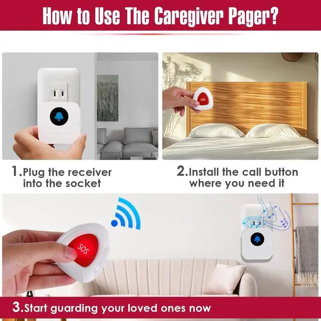 Complete 2x2 Set for Dual Peace of Mind This caregiver pager kit includes 2 waterproof SOS call buttons and 2 plug-in receivers, offering an immediate and reliable solution for families needing attention. Perfect for monitoring two residents simultaneously or securing multiple key areas like the bedroom and bathroom, it provides double the peace of mind for caregivers and their loved ones. ^^ 500+ FT Long Range for Whole-Home Freedom Enjoy unparalleled mobility and coverage! The wireless signal effectively transmits through walls up to 500 feet in open areas. Caregivers can carry the plugged-in receiver from the bedroom to the kitchen or garden, while the person in need can press the button from any corner of the house, ensuring help is always within reach.