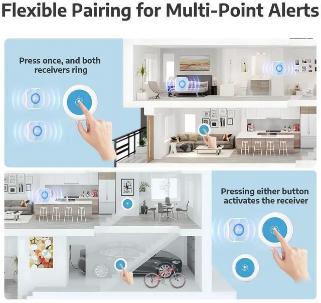 ^^ Expandable & Pre-Paired System - OFFNOVA transmitters and receivers come pre-paired for instant use, saving setup time. Each receiver pairs with up to 5 call buttons, and each panic button links to 5 receivers, offering flexible room customization. Pairings can also be adjusted or canceled as needed for full control. ^^ Clear & Customizable Sound Alerts - Offers 38 distinct ringtones and adjustable volume from 30dB to 80dB, perfect for most home environments, larger spaces such as hospitals, nursing homes, and care facilities. The sound is strong enough to penetrate multiple walls without causing discomfort, so you can hear alerts clearly even when working outdoors.