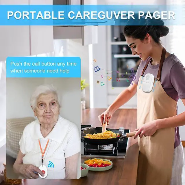 Wireless Caregiver PagerChunhee Wireless Caregiver Pager with 2 Call Button+ 1 Portable Vibration Receiver with 5 melodies. The idea is Both Caregiver and Patient/Elderly/Resident/Handicapped/Sick Freedom while Still Calling for Help at Home. Not Need to Yell to get Someone's Attention. ^^ Easy to UseSimply touch the SOS call button to seek a caregiver for help and assistance. Makes caring for your loved one easier. Only wake up the night shift caregiver, and not disturb others. ^^ Effective Call Bell SystemThe wireless nurse alert system for small family home or care unit. The wireless signal range between the pager and button is up to 800 feet in open area.