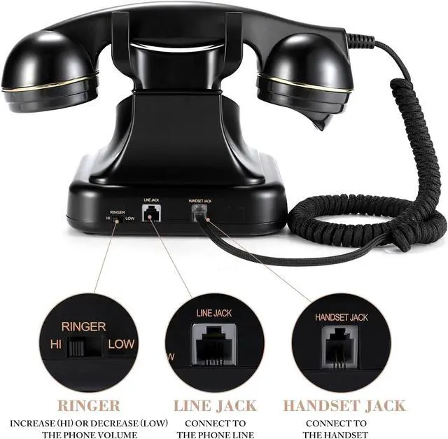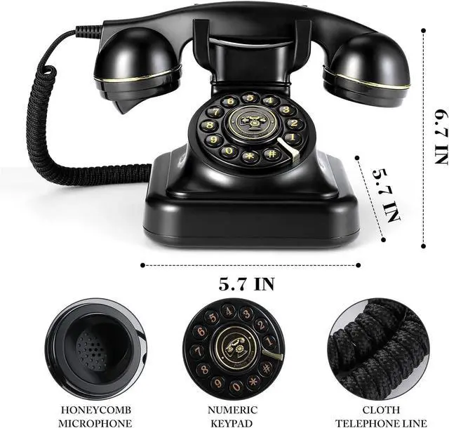 Vintage Design With its retro-style design, this telephone is sure to bring back memories of a bygone era. ^^ Fashionable Statement Piece This telephone is perfect for adding a stylish touch to any space in your home or office ^^ Retro Mechanical Ringtone The classic corded phone's bell is a traditional mechanical chime that makes a clear and sweet sound, which can evoke a nostalgic sensation. You will enjoy the old times when you call up somebody or get a call. ^^ High-Ouality Construction Made from premium materials, this phone is built to withstand the test of time and is sure to become a cherished accessory in any home ^^ Easy to UseSimple and straightforward, this phone is user-friendly and straightforward.