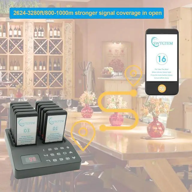 Long signal range; restaurant pager system work distance up to 800-1000m/2624-3280 ft in open areas; 300-500m/984-1640 ft in open areascan keep customers waiting in the car ^^ 4 Alert modes; Shake+flash+buzz, shake+flash, flash+buzz, flash only. It avoid to long waiting lines that customers can go wherever they want. 5-250s Adjustable prompt time ^^ Waterproof and Oilproof; Even if the customer accidentally splashes water and oil, it can still work normally and does not support soaking in water ^^ Extended