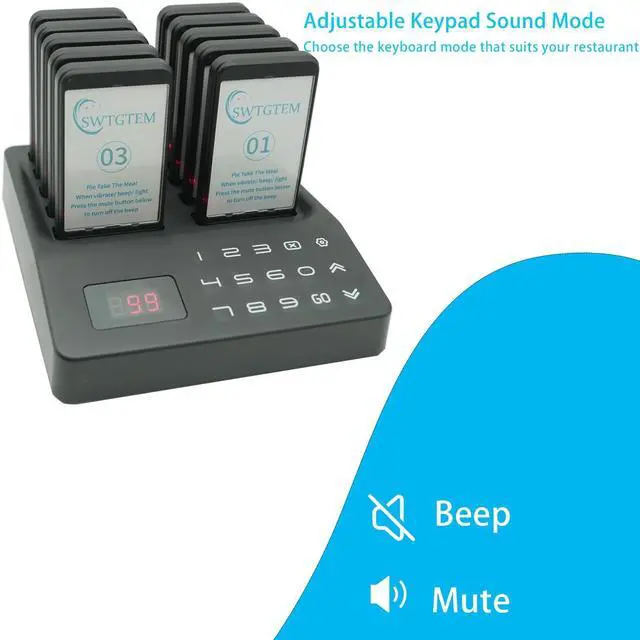 More function: Keyboard has 2 modes; beep or mute mode; Replaceable Sticker; Set all the pager with same number, you can One-Click Power Off or One-Click Group Call