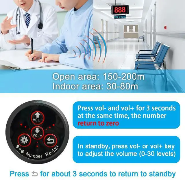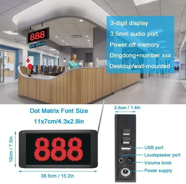 Screen Specification: 1. With high strength ABS+Metal cover2. Wall mounted or place on the table3. Dot matrix display, show one group number 4.3 -digits from 001-999 or NO. 001-NO. 9995.