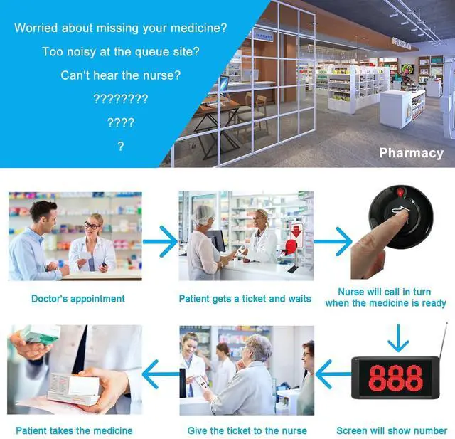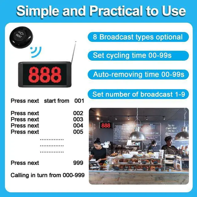 A: You only need to give the customer a queue number (take a number from ticket dispenser), when it is the turn, press the NEXT key on the calling button, the screen receiver will display and broadcast, then the customer will go to the service place.