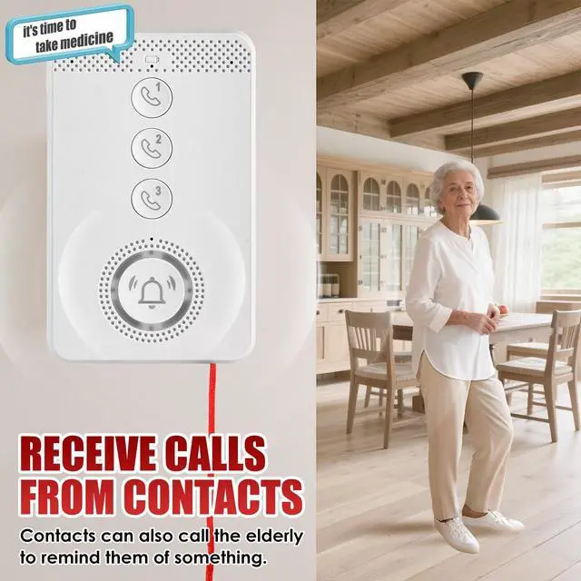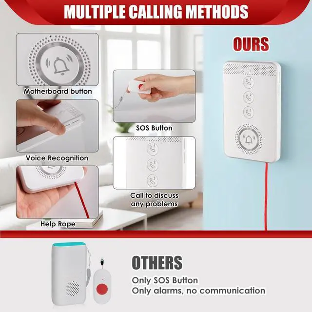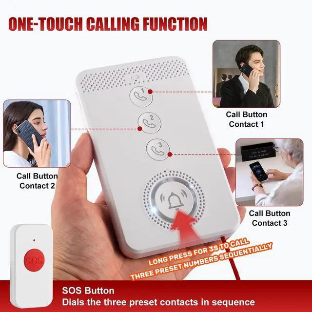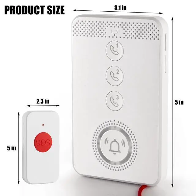 Note: Insert a U. S. SIM card. ^^ Two-Way Call & Flexible AnsweringSupporting two-way calls, trusted contacts can directly voice call the user. Choose from three easy answering ways: auto-answer after three rings, press any button to connect, or respond via the SOS button. ^^ Multiple Calling MethodsProvides flexible calling options: use voice recognition, press any button on the main unit, pull the emergency cord, or simply press the SOS button. Designed for quick, reliable access to help in any situation. ^^ Wireless FreedomComplete freedom and peace of mind. Its versatile design is both portable for on-the-go use and wall-mountable for stationary convenience, all protected by water-resistant durability. Simple, reliable, and ready to assist anywhere it's needed. ^^ Ideal for Various UsersDesigned for the elderly, disabled, patients, and caregivers, this wireless caregiver pager system provides peace of mind through reliable, flexible, and easy-to-use communication.