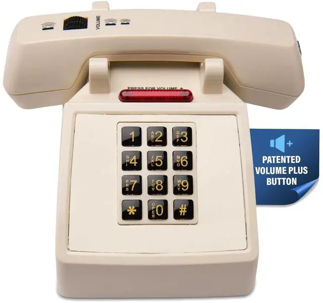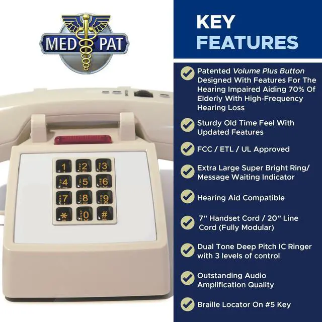 Its compatibility with AC and DC neon and some LED systems enhances its versatility for various setups, whether at the office or home. The D2600C also features a braille locator on the #5 key, catering to a diverse range of users. Whether you're looking for a corded phone for your home office desk, an analog phone with a retro feel, or a reliable landline phone for seniors, the Med-Pat D2600C in beige is the ideal choice. Transform your communication experience with this traditional desk phone that seamlessly blends classic aesthetics with modern functionality.