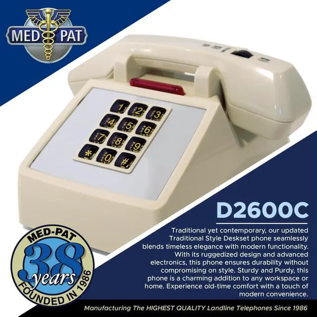 Explore the nostalgia of old telephones without compromising on the conveniences of the present. Upgrade your home or office setup with the timeless appeal of the Med-Pat D2600C.