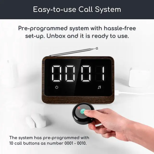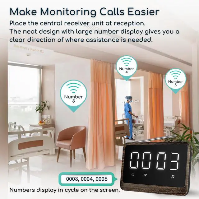SIMPLE TO USE AND EASY TO SETUP: The Central Receiver Unit is already paired with wireless call buttons at ex-factory and ready to use. Unbox the wireless call system and place with battery and it is ready function and call. Wide range of applications including nursing home, clinic, physical therapy, assisted living and wellness centers. ^^