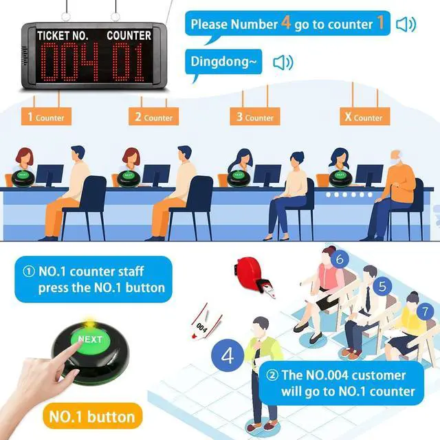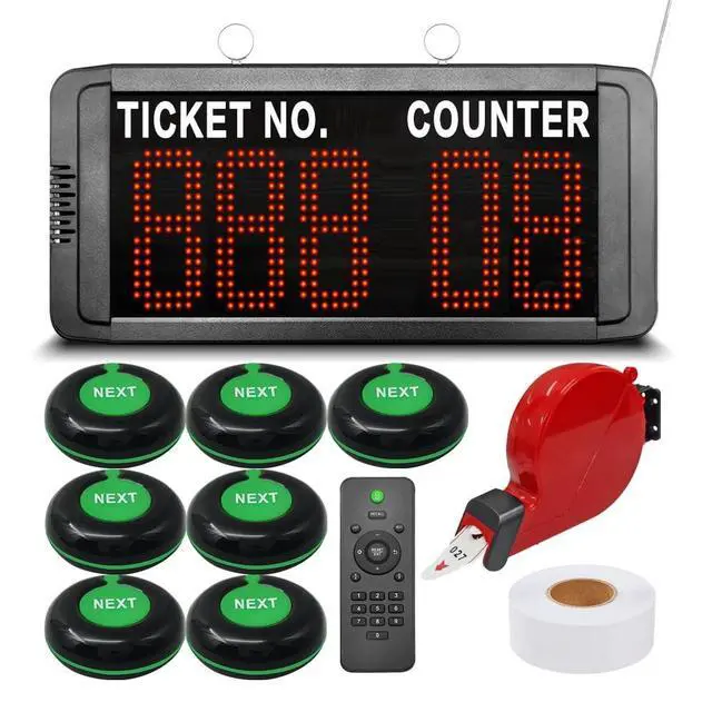 KOQICALL Take a Number Machine Queue Wireless Calling System for Customers with 1 LED Dot Matrix Display Broadcast Ticket and Counter Number 7 Waterproof Next Call Button 1 Red Ticket Dispenser
