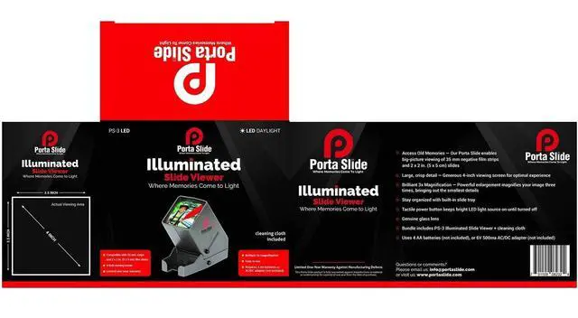 Porta Slide PS-3 Slide Viewer, View 2x2 in. Slides, 35mm Film Strips & Negatives, LED Viewing light, 4 in. Screen, 3x Magnification w/Cleaning Cloth, USB Power Cable included