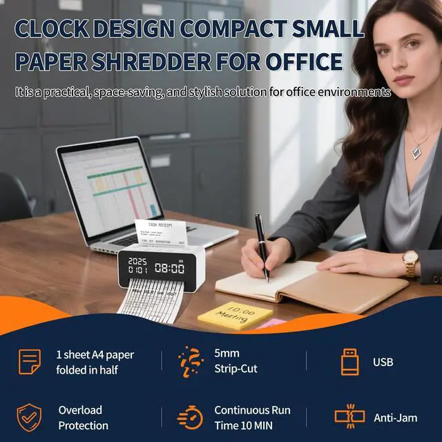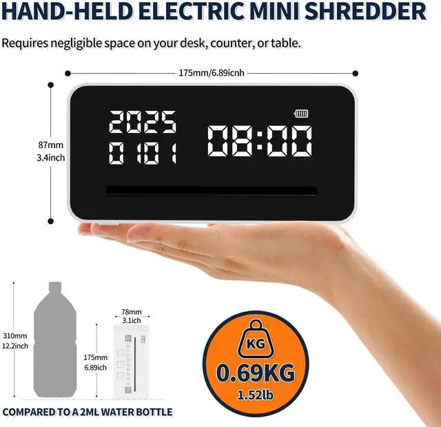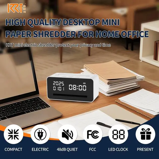 High Quality Electric Mini Shredder With FCCThe KRT compact paper shredder uses a DC motor and high-quality blades, works well at shredding paper into strips compared to manual shredders, protecting personal privacy. It is also FCC certified, ensuring quality assurance. ^^ Clock Design Compact Paper Shredder for HomeThe clock-shaped paper shredder not only functions as a paper shredder but also serves as a clock. With dimensions of just 17.5 x 7.8 x 8.7 cm, it is compact and space-saving, easily fitting into a drawer. Takes up barely any room on your desk, counter, or table.