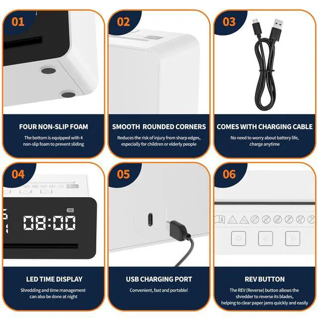 ^^ USB Rechargeable Portable ShredderWith a USB charging mode and weighing only 0.69 kg, this is a great lightweight productit is easy to fit into a bag and carry around. You can shred paper anytime, anywhere, ensuring your privacy is protected. ^^ A Great Gift for Relieving StressWrite down worries and shred them away! Helps relieve psychological stress. The perfect gift for friends and family on Valentines Day, Christmas, birthdays, and other special occasions. ^^ No Shredding Bucket Easy to Clean This desktop mini paper shredder does not come with a waste bin.