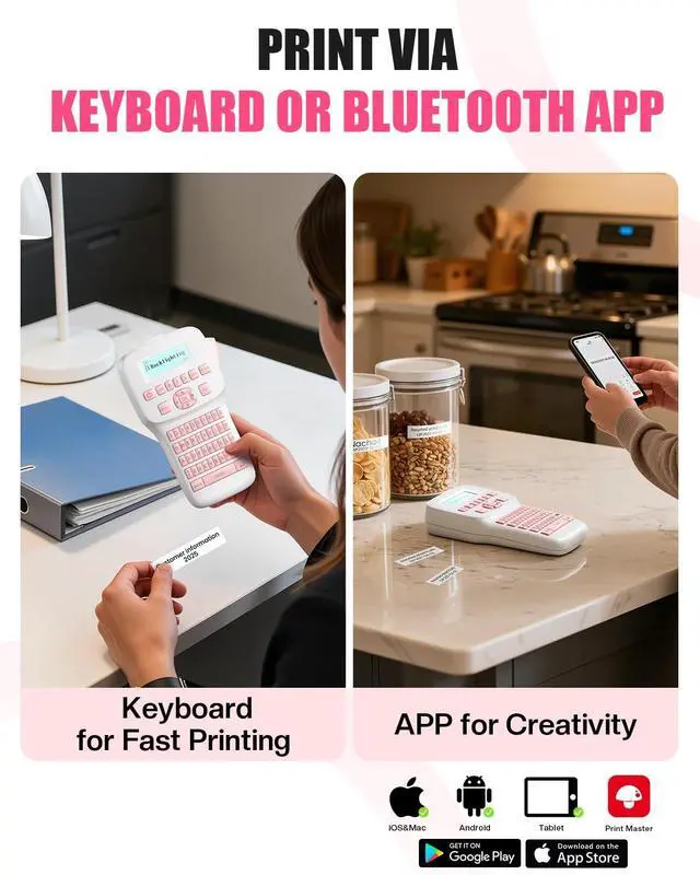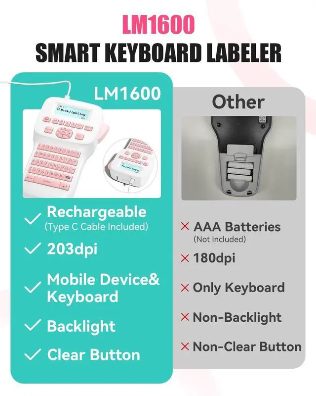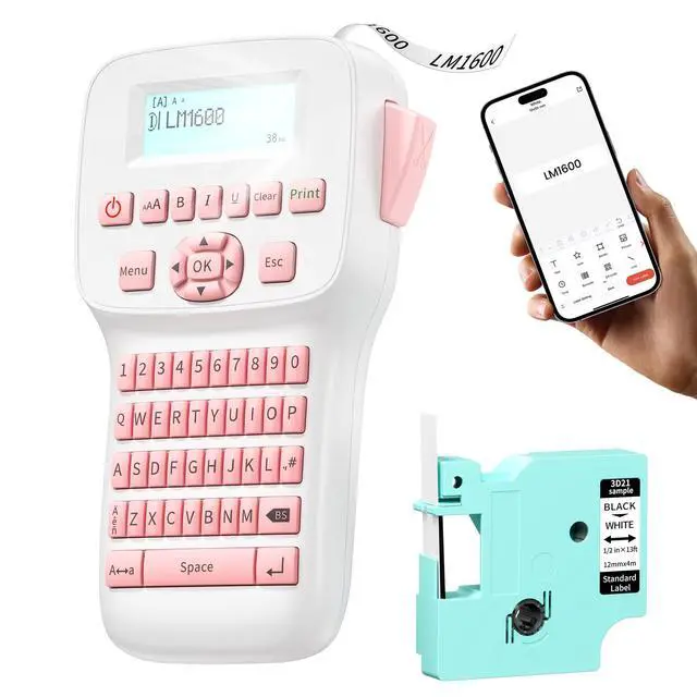 Complete Package: This pink label maker includes the LM1600 label maker machine and a 12mm x 13ft sample tape, and a Type C cable. the kit supports immediate use as a portable label maker for home or industrial label maker for professionals. The inclusion of label maker with tape ensures quick start-up