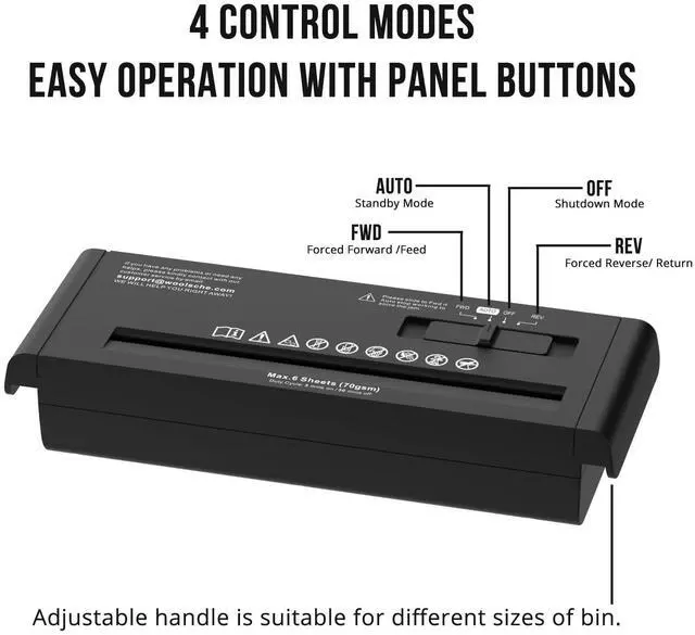 Easy Operation: Shredder also features a 4-mode control switch (Auto/Off/Reverse/Fwd), with the reverse mode & Fwd mode helping to release any jammed paper or forced forward/ feed, enhanced shredding strength ^^