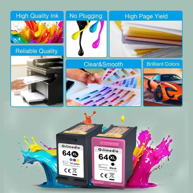 Page Yield: 700 pages for HP 64xl black ink cartridge, 450 pages for HP 64xl color ink cartridge at 5% coverage ^^ GILIMEDIA ink 64 Cartridges, featuring high-quality print heads, ensure a smooth ink flow throughout the printing process, effectively preventing paper jams and delivering consistent and