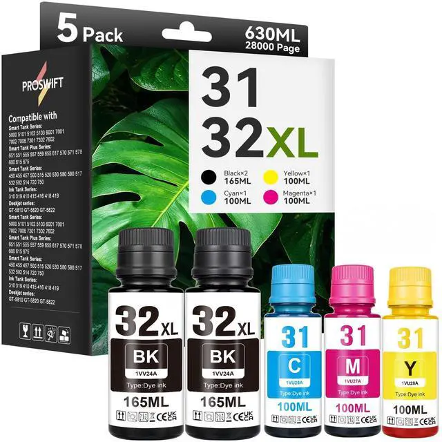 Compatible Printers: 32XL black ink bottle 31 ink bottle set compatible replacement for HP Smart Tank Printer 7602 6001 7301 5100 5101 5000 5102 757 7601 755 7601 6002 7302 7001, HP Smart Tank Plus 651 551 wireless all-in-one etc. ^^ Higher Yield Page 31 32XL ink bottle