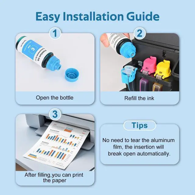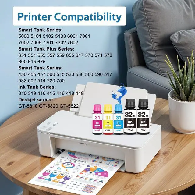 Perfect Prints: Our 31 32XL ink leak-proof bottles automatically stop for clean, hassle-free refillsno squeezing needed. Experience vibrant, fade-resistant colors and smooth, clog-free performance every time. Simple, clean, and reliable. Easily compatible with HP Smart Tank printers.