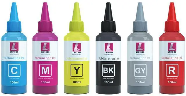 Package Includes: 100ML Black Sublimation Ink, 100ML Gray Sublimation Ink, 100ML Cyan Sublimation Ink, 100ML Magenta Sublimation Ink, 100ML Yellow Sublimation Ink, 100ML Red Sublimation Ink, Total 600ML, 6 Syringes, 6 needles ^^