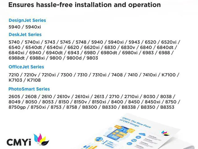 Printer Compatibility: HP DesignJet 5940, 5940xi, DeskJet 5740, 5740xi, 5743, 5745, 5748, 5940, 5940xi, 5943, 6520, 6520xi, 6540, 6540dt, 6540xi, 6620, 6620xi, 6830, 6830v, 6840, 6840dt, 6840xi, 6940, 6940dt, 6943, 6980, 6980dt, 6980xi, 6983, 6988, 6988dt, 6988xi, 9800, 9800d, 9803, OfficeJet 7210, 7210v, 7210xi, 7300, 7310, 7310xi, 7408, 7410, 7410xi, K7100, K7103, K7108, PhotoSmart 2605, 2608, 2610, 2610v, 2610xi, 2613, 2710, 2710xi, 8030, 8038, 8049, 8050, 8053, 8150, 8150v, 8150xi, 8400, 8450, 8450xi, 8750, 8750gp, 8750xi, 8753, 8758, B8300, B8330, B8338, B8350, B8353 ^^
