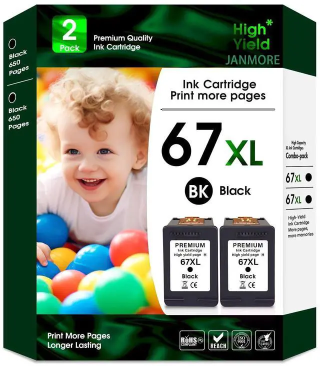 Package includes: (2 Black) 67XL black ink cartridge Compatible for hp 67 ink black ink cartridge combo pack. Each ink 67xl printer cartridge is equipped with the latest chip, and is strictly tested in production to ensure that each ink 67 cartridge can be recognized and used by the printer.