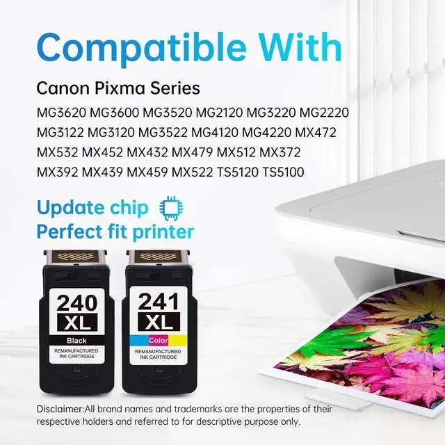 240xl black ink cartridge and 241xl color ink cartridge serves as a direct replacement for canon printer ink 240 241, including the matching canon pg-240 black and cl-241 color variants. It is fully compatible with printers using Canon mg3600 Canon ink cartridges and Canon mg3620 ink cartridges, ensuring a seamless fit and reliable print performance. ^^ For canon mg3600 ink cartridges compatible for printers: for Canon PIXMA MG3620 MG3600 MG3520 MG2120 MG3220 MG2220 MG3122 MG3120 MG2220 MG3522 MG4120 MG4220 printers ^^ For canon pixma mg3620 ink cartridges compatible for printers: for Canon PIXMA TS5120 TS5100 PIXMA MX532 MX452 MX472 MX432 MX479 MX512 MX372 MX392 MX439 MX459 MX522 printers ^^ For canon PG-240xl CL-241xl combo pack high yield: 650 pages per PG-240xl black ink cartridge, 560 pages per CL-241xl color ink cartridge at 5% coverage page ^^ For Canon 240XL 241XL combo pack 240xl and 241xl ink cartridge comes equipped with smart chips, allowing you to conveniently monitor and track ink levels at any time. ^^ 240 241 ink cartridges for canon printers equipped with smart chips to ensure each ink cartridge will be recognized by printers quickly and print true-to-life photos, resists fading and smudging