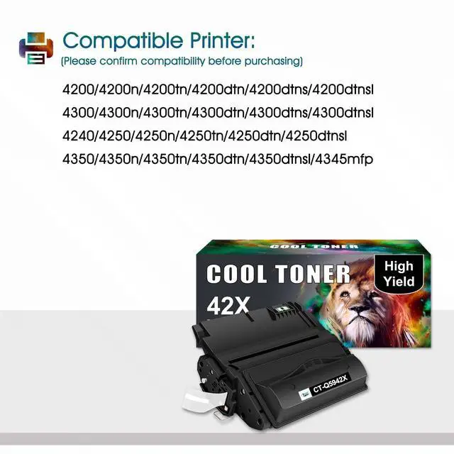 Compatible for HP 42X Q5942X High Yield Toner Cartridge also Available in for HP 42A Q5942A (Q1338A) Standard Yield Toner Cartridge ^^ Compatible for HP 4200 4220N 4200TN 4200DTN 4200DTNS 4200DTNSL; 4250 4250N 4250TN 4250DTN 4250DTNSL; 4300 4300N 4300TN 4300DTN 4300DTNS 4300DTNSL; 4350 4350N 4350TN 4350DTN 4350DTNSL 4345MFP Printer ^^