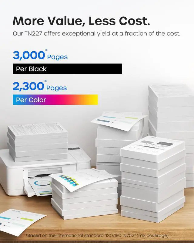Page Yield: Up to 3000 Pages per Black TN227BK Cartridge, Up to 2, 300 pages per Color TN 227 C/M/Y TN227 (CMY) Cartridge at 5% Coverage (Letter/A4) ^^