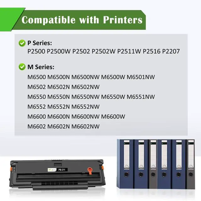 1. Item includedCompatible Toner Cartridge PB-211 PB211 PB 211 PB-211EV PB211EV PB 211EV Black. ^^ 2. Printing yield (approximate) 1600 pages black at 5% coverage, A4 paper, letter. (ISO/IEC standard). ^^ 3. Compatible for printersCompatible for P2500 P2500W P2502 P2502W P2511W P2516 P2207; M6500 M6500N M6500NW M6500W M6501NW; M6502 M6502N M6502NW M6550 M6550N M6550NW M6550W; M6551NW M6552 M6552N M6552NW M6600 M6600N M6600NW M6600W; M6602 M6602N M6602NW Printers. Not Compatible for P2502W Plus which work with PB-212 Toner ^^ 4. ISO Quality Factory Our toner cartridges are manufactured with new components and are manufactured in the factory that meets ISO 9001 quality management, ISO 14001 environmental management and ROHS environmental standards.